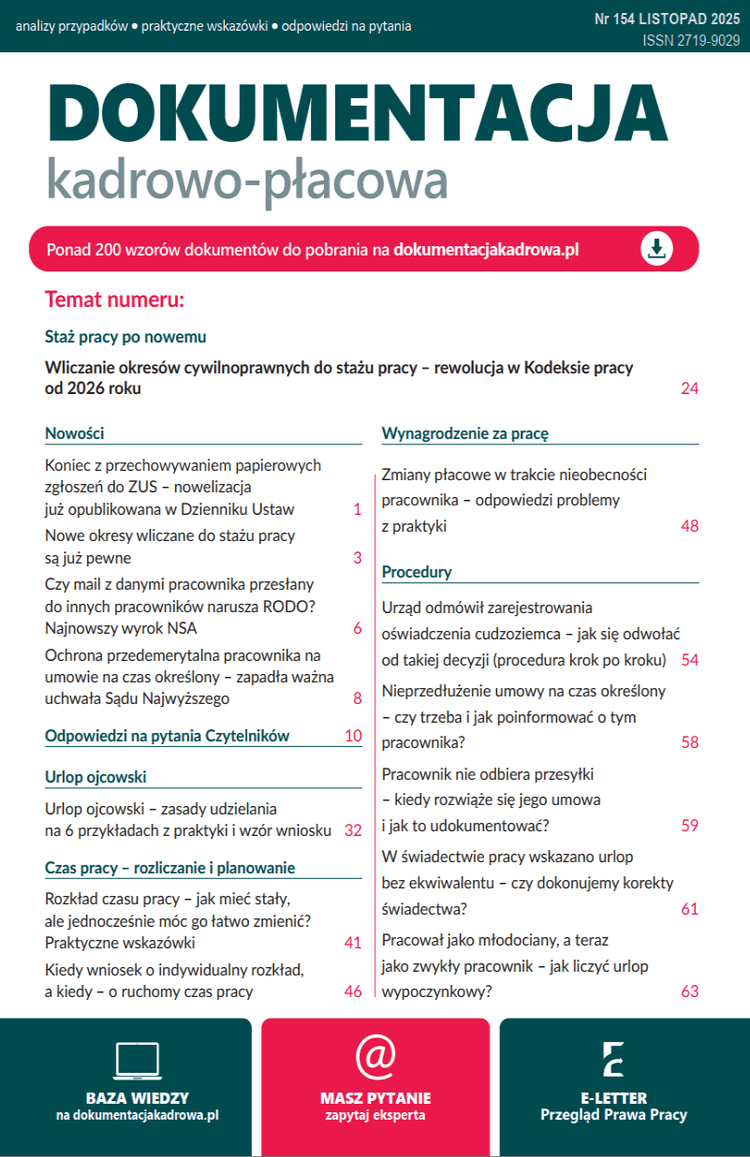 W tym numerze zwracam Twoją uwagę przede wszystkim na zmianę w przepisach, która w znaczący sposób wpłynie nie tylko na uprawnienia pracownicze, ale również na obowiązki działów kadrowych. Chodzi o wliczanie umów cywilnoprawnych i działalności gospodarczej do stażu pracy. Dowiedz się m.in.: